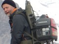 Hierboven: Dit is Wenzel. He is professor in the antroplogie in Oslo en bestudeert de wetenschappers in Ny-Ålesund door mee te doen in ons veldwerk. Vandaag is hij dus veldassistent en wordt gebruikt als muilezel. |