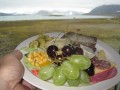 | We have many extraordinary meals up here. But especially in the first days after arrival of the monthly supply vessel Nordbjörn, the dishes are full with fresh fruits and salad. This luch I had cherries and grapes. Yesterday we had desert with strawberries, ice and wipped cream. | |